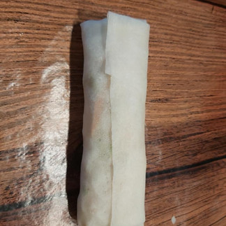 Nu rol je loempiavel 2x door, je pakt beide zijkanten en die vouw je naar het midden toe (over het gerolde deel heen) en vervolgens rol je de loempia door