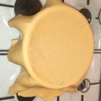 ℴ Rol het andere deel uit met behulp van wat bloem en een deegroller tot je een mooie plak heb die flink wat groter is als je vorm zelf. Je legt het deeg er met één armbeweging overheen en drukt het netjes aan tot boven aan de randen van de vorm.